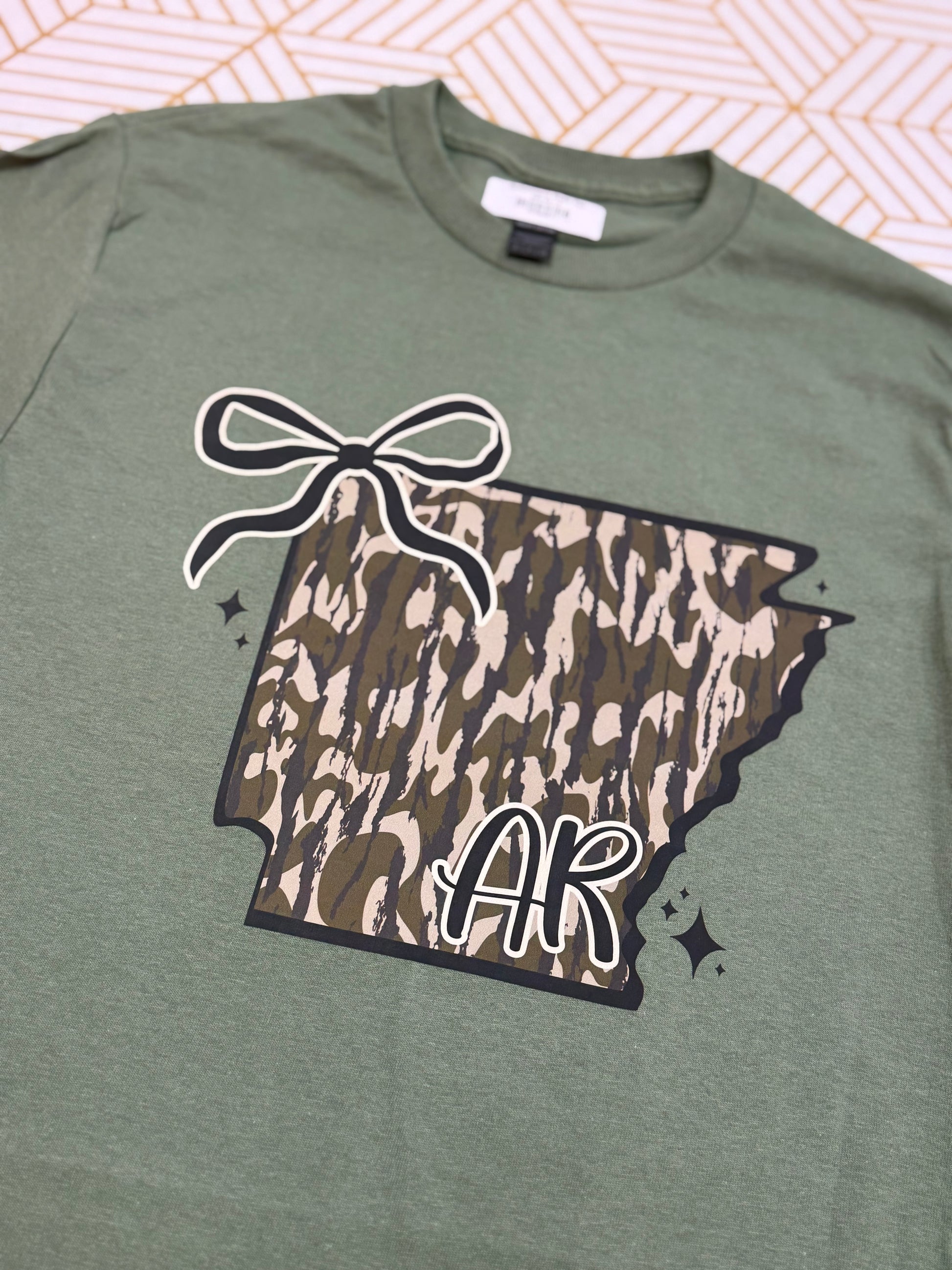 Show off your adventurous side with the Bottomland State Tee, featuring a bold bow graphic on a rugged bottomland camo background. Perfect for those who love the outdoors and a touch of playful style, this tee blends comfort with a hint of wild spirit. Whether you're out exploring or just hanging out, it’s a fun way to wear your passion.