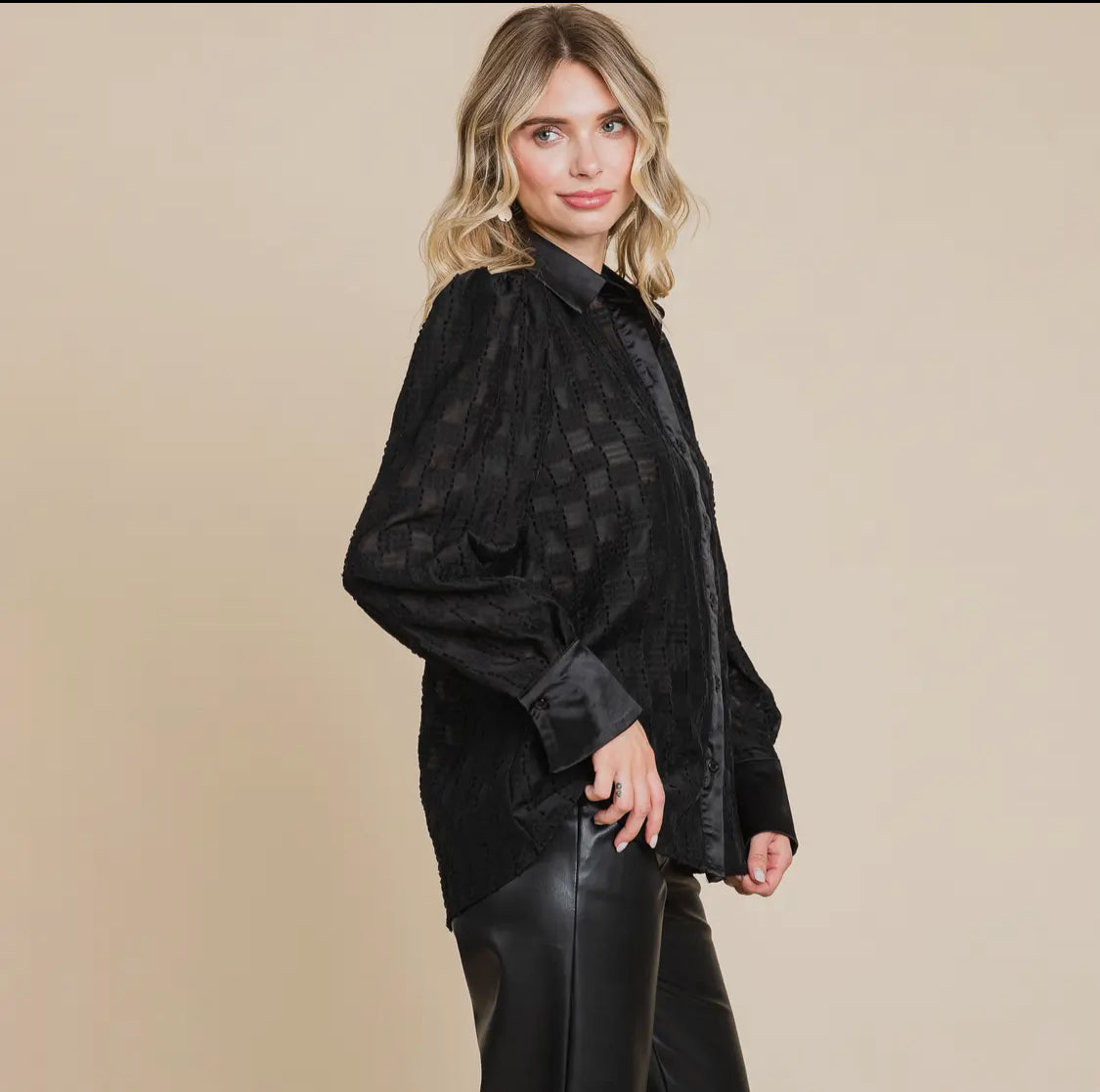 Button down detail - Satin collar, placket and cuffs. Sheer Sleeves